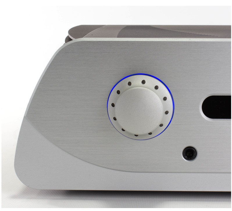 Au centre de la façade trône une fenêtre abritant un afficheur OLED bleu à faible consommation. De chaque côté on trouve un gros potentiomètre logique en aluminium massif : celui de droite gère le volume (par rotation) et la balance (par pression), tandis que celui de gauche gère la sélection de source (par rotation) et le M/A (par pression). Il est à noter qu’il y a un rétroéclairage autour de ces deux boutons que l’on peut définir en rouge, bleu ou violet.