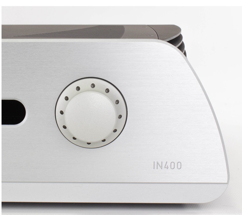 L’IN400 SE est alimenté en son centre par un énorme transformateur torique de plus de 1000 VA ! Le filtrage est confié à 12 condensateurs chimiques dédiés à l’audio, totalisant plus de 93400 µF de capacité ! Les étages analogiques reçoivent des condensateurs MKP Mundorf blindés.