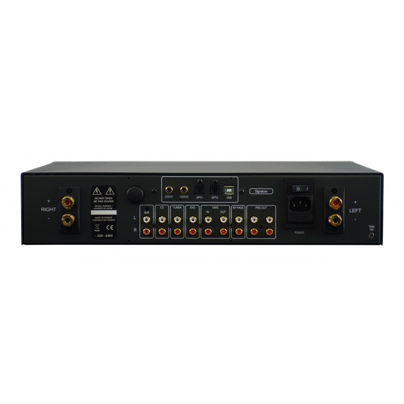 La puissance est confortable avec 120Wrms/8Ω et 200Wrms/4Ω, soit 2 x 30W en pur classe A. Cela lui permet d’être associé avec de nombreuses enceintes Hi-Fi, même réputées difficiles à driver.