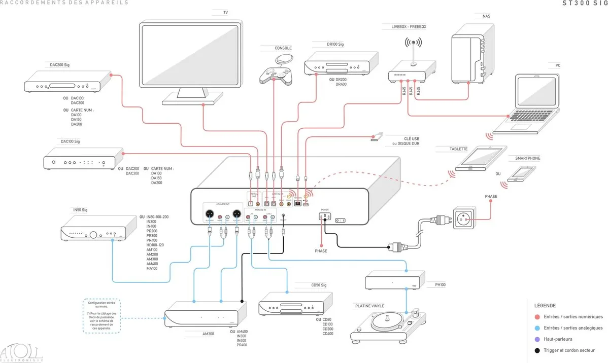 En plus de ses entrées numériques, le lecteur réseau Atoll ST300 Signature met à disposition deux entrées asymétriques RCA pour y associer les différentes sources de votre installation lorsque l’Atoll ST300 Signature est utilisé comme pré-amplificateur. Enfin, une sortie symétrique XLR et une sortie asymétrique RCA facilitent l’association de l’Atoll ST300 Signature à tout amplificateur ou directement à un amplificateur de puissance. Une sortie trigger permet par ailleurs de déclencher ou d’éteindre l’appareil de votre choix en même temps que le lecteur réseau et pré-ampli Atoll ST300 Signature.