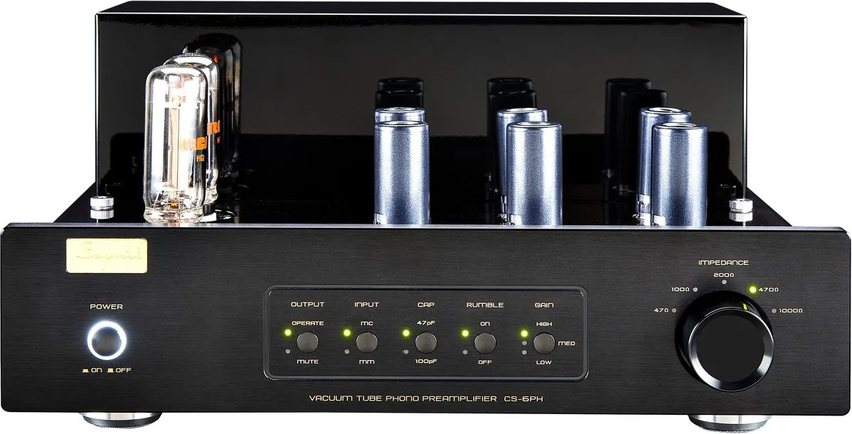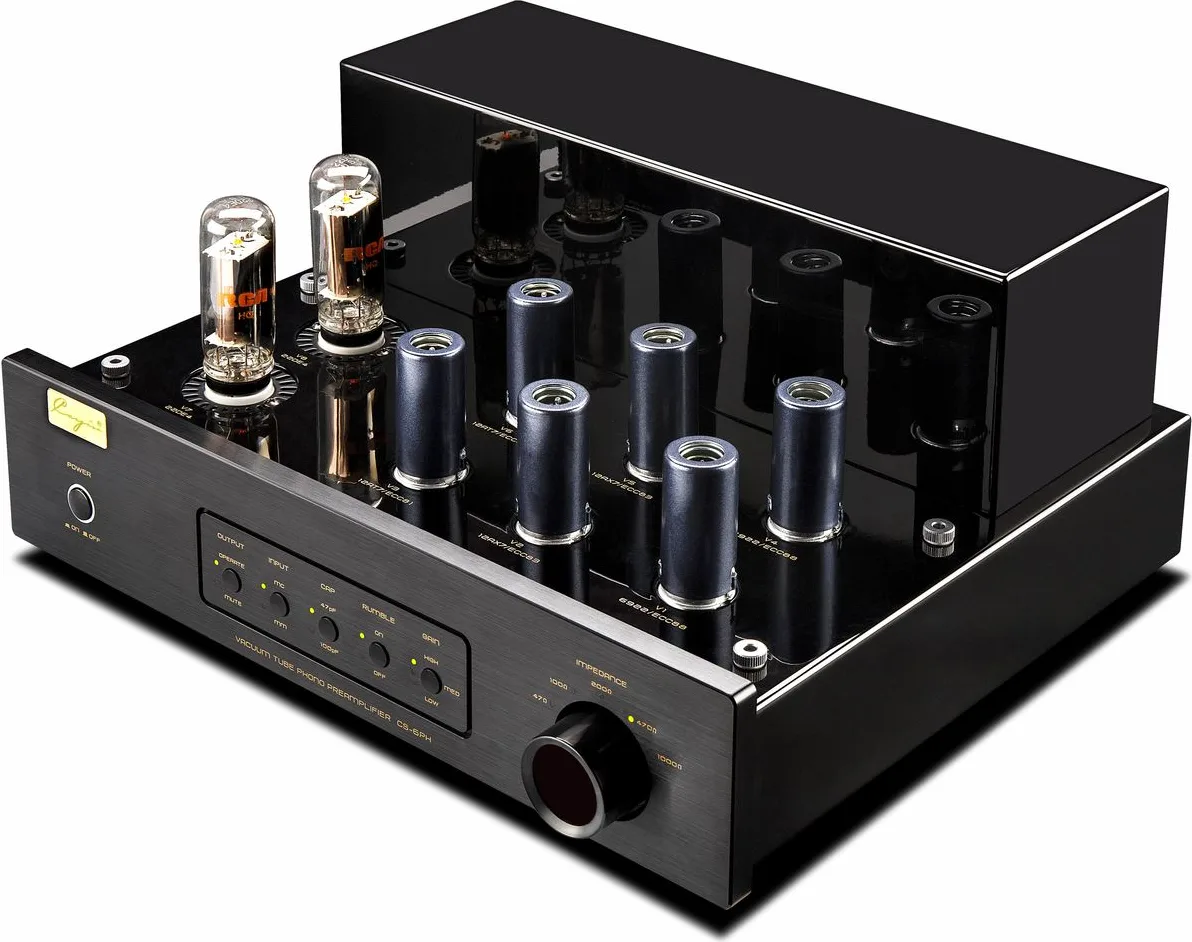 Le Cayin CS-6PH est un préamplificateur phono fonctionnant entièrement à tubes. Deux tubes 6922EH Electro Harmonix sont utilisés pour l’amplification MC et deux tubes ECC83 JJ Electronics sont utilisés pour l’amplification MM. Le signal est ensuite dirigé vers un tube 12AT7 servant d’étage de sortie. Enfin, le CS-6PH fait appel à deux tubes 22DE4 RCA pour le redressement pour garantir une amplification entièrement à tubes.