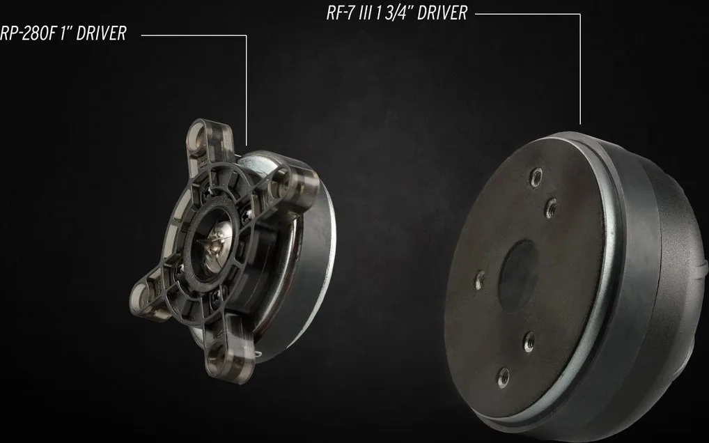 Le pavillon Tractrix de l’enceinte Klipsch RF-7 Mark III est un modèle hybride, dont le design a été complètement modifié – tant pour la gorge que la bouche – et qui emploie désormais un revêtement composite à base de caoutchouc, afin d’éliminer toute dureté liée aux résonances. Toute la face avant de l’enceinte est d’ailleurs revêtue d’un revêtement similaire. L’angle de diffusion horizontal a été augmenté de 50 % par rapport au modèle remplacé et la pièce de phase du tweeter totalement redessinée, pour une diffusion plus homogène du son.