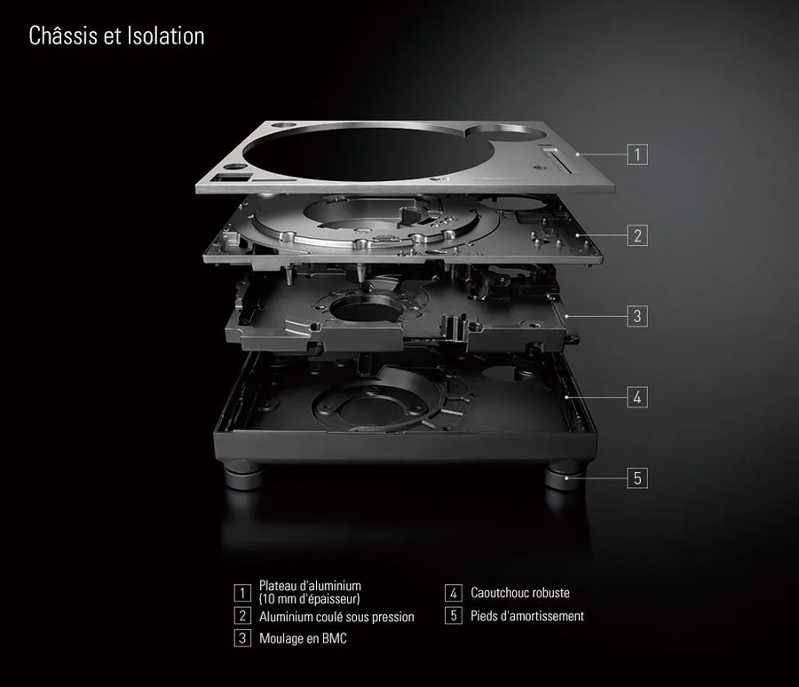 La platine vinyle Technics SL-1200G est dotée d’un châssis conçu à partir de quatre couches de différents matériaux. La couche inférieure de cette platine vinyle est réalisée en caoutchouc robuste, celle-ci est destinée à amortir les vibrations. Au-dessus, on retrouve deux couches l’une en aluminium coulé sous pression et la seconde en résine BMC (Bulk Molding Compound). Ces deux couches internes contribuent grandement à la masse de cette platine (18 kg au total). Le dessus de la platine vinyle est quant à lui recouvert d’une plaque d’aluminium d’une épaisseur de 10 mm avec une finition brossée.