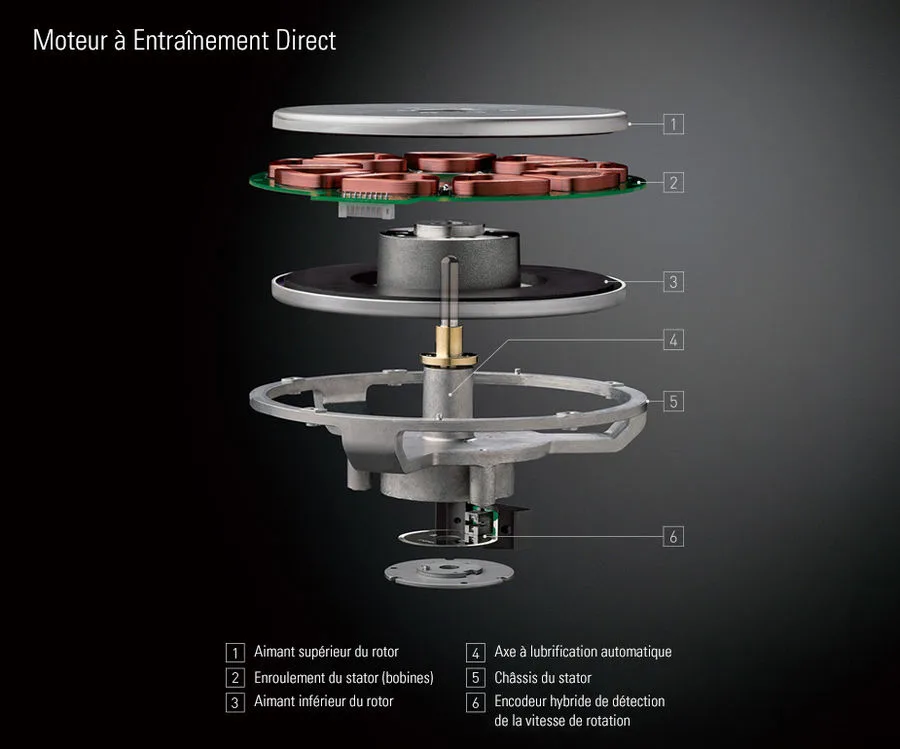 Le moteur de cette platine Technics SL-1200G a été retravaillé afin d’améliorer les performances de la platine et répondre ainsi aux exigences des audiophiles. La conception de ce moteur a donc été effectuée avec pour objectif de réduire significativement les vibrations que peut transmettre le moteur au plateau. Ainsi, pour répondre à cette exigence le constructeur adopte un moteur à double rotor (sans-balai). Cette technologie permet de réduire la charge des roulements et atténue les vibrations issues du fonctionnement du moteur. Celui-ci n’intègre par ailleurs pas de noyau de fer, ce qui lui confère une grande précision et réduit les vibrations à basse vitesse. De plus, la vitesse du moteur est analysée par un capteur de vitesse haute-précision et contrôlée par un microprocesseur pour offrir une vitesse de rotation précise et constante. L’axe de rotation est quant à lui imprégné d’huile dans le but, là aussi d’offrir une rotation fluide et constante au plateau.