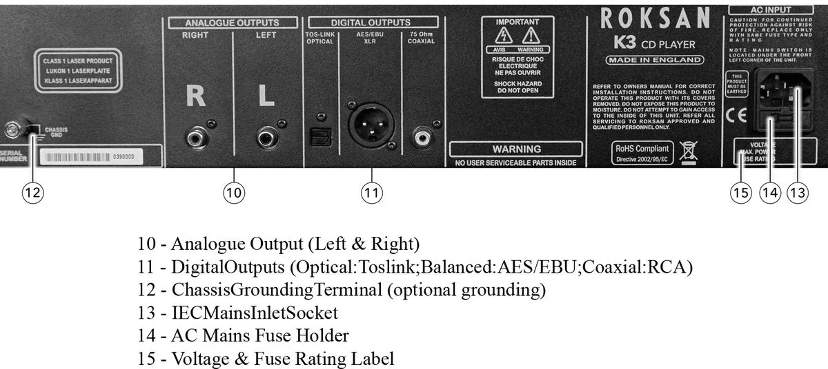 La connectique du lecteur Roksan K3 CD DI comprend trois sorties numériques S/PDIF (coaxiale RCA, Toslink et AES/EBU) pour la connexion à un DAC audio externe, ainsi qu’une sortie audio analogique stéréo RCA plaquée or.