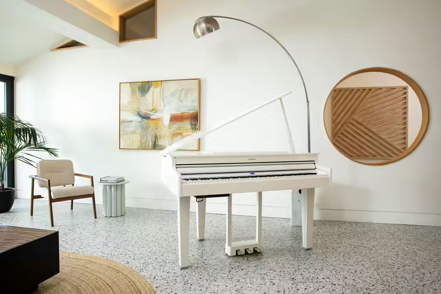 Avec son look étonnant et ses courbes fluides, le GP-6 vous procure la majesté d’un piano pour un encombrement réduit par rapport à un piano à queue standard. Sa taille est certes réduite, mais vous profitez tout de même des performances d’un instrument de taille standard. Tout comme sur un piano à queue acoustique, son couvercle supérieur peut s’ouvrir pour procurer davantage de projection sonore, et son couvercle de clavier amovible protège les touches lorsqu’elles ne sont pas jouées. Les boutons tactiles minimalistes disparaissent lorsque le rétro éclairage est éteint, procurant une esthétique véritablement acoustique et éliminant les risques de distraction durant le jeu.