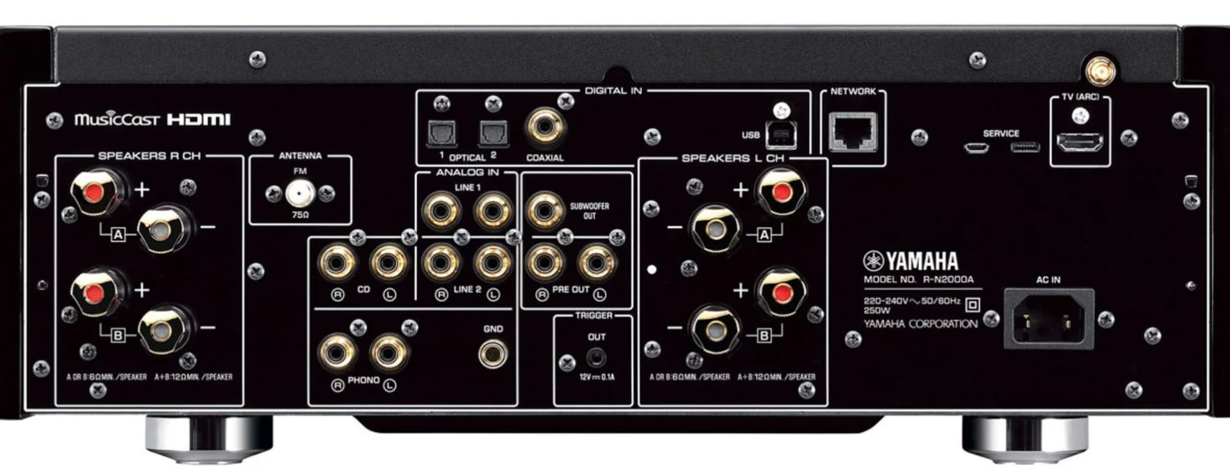 Extrêmement complet, le R-N2000A est également capable d’accueillir une multitude de sources audio numériques et analogiques. Vous pouvez tout d’abord compter sur deux entrées optiques et une entrée coaxiale afin de connecter un lecteur CD ou un lecteur réseau externe. Un port USB Type-B est également intégré pour profiter des bienfaits de son DAC ES9026PRO avec l’ordinateur de votre choix. Dans cette configuration, un décodage sans perte des fichiers Hi-Res PCM jusqu’à 32 bits / 384 kHz et DSD 11,2 MHz est assuré ! Le Yamaha R-N2000A peut également reproduire le son d’un téléviseur 4K UHD dans les meilleures conditions grâce à une entrée HDMI ARC. La section analogique n’est pas en reste, avec trois entrées RCA et une entrée Phono dédiée au branchement d’une platine vinyle. Par ailleurs, on retrouve évidemment des sorties Pre-Out, Sub et jack 6,35 mm afin d’y associer un ampli de puissance, un caisson de basses et un casque hi-fi pour écouter de la musique en intimité.